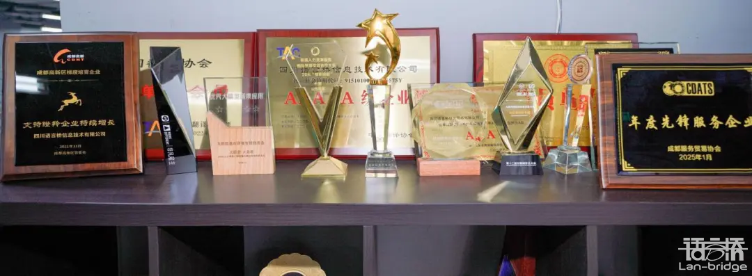 歷經(jīng)25年,語言橋獲得過多種獎項和榮譽,如中國十佳翻譯服務企業(yè)、中國翻譯服務行業(yè)5A級筆譯+口譯認證企業(yè)、國家語言服務出口基地、國家高新技術企業(yè)、四川省技術中心等。同時,語言橋也獲得了多項國際標準化組織的認證,如 ISO 9001質量管理體系認證、ISO 27001信息安全管理體系認證、ISO 45001職業(yè)健康安全管理體系認證等。