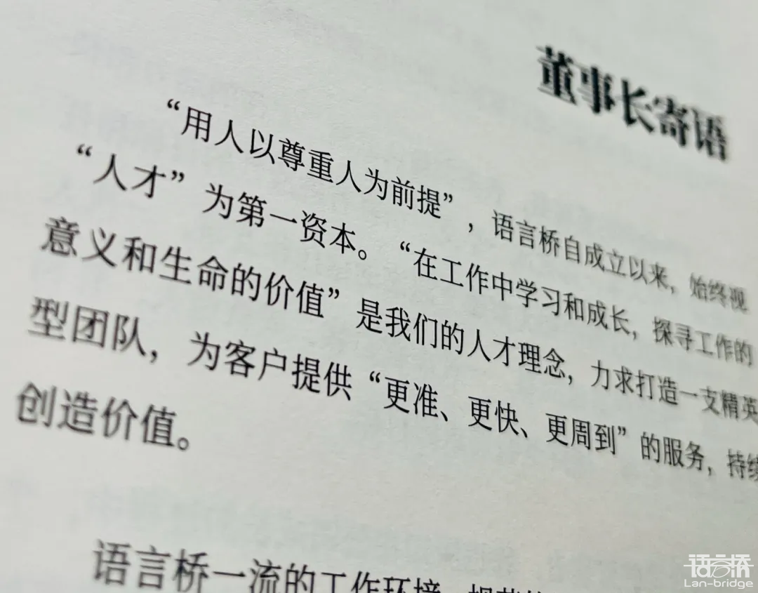 我還記得2005年語言橋第一本《企業(yè)文化手冊》中的第一句話,“用人以尊重人為前提”的人才理念。語言橋自成立以來,始終視“人才”為第一資本,打造“簡單、真誠、友誼”的企業(yè)文化。提倡在工作中學習和成長,探尋工作的意義和生命的價值。正是這些經(jīng)營理念和價值觀,為語言橋的發(fā)展注入了源源不斷的動力和能量。加上語言橋職業(yè)化的管理團隊,積極向上的工作氛圍,孜孜不倦地學習和創(chuàng)新精神,才成就了語言橋的今天。當前,我對于語言橋的現(xiàn)有團隊更有信心,期待公司下一步在技術化轉型、國際化拓展、多品牌戰(zhàn)略的征途中,取得更好的成績。