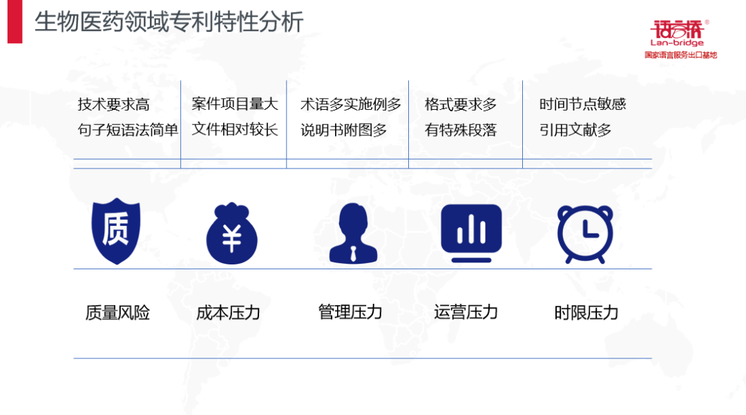 根據生物醫(yī)藥領域特點帶來的質量風險,成本壓力,管理壓力,運營壓力,時限壓力,語言橋采用了定制的譯員服務團隊,責任清晰的,高質量,高一致性的專利翻譯服務,使申請人在得到高質量的專利翻譯服務達到降本增效的同時,也實現國際專利的精細化管理。