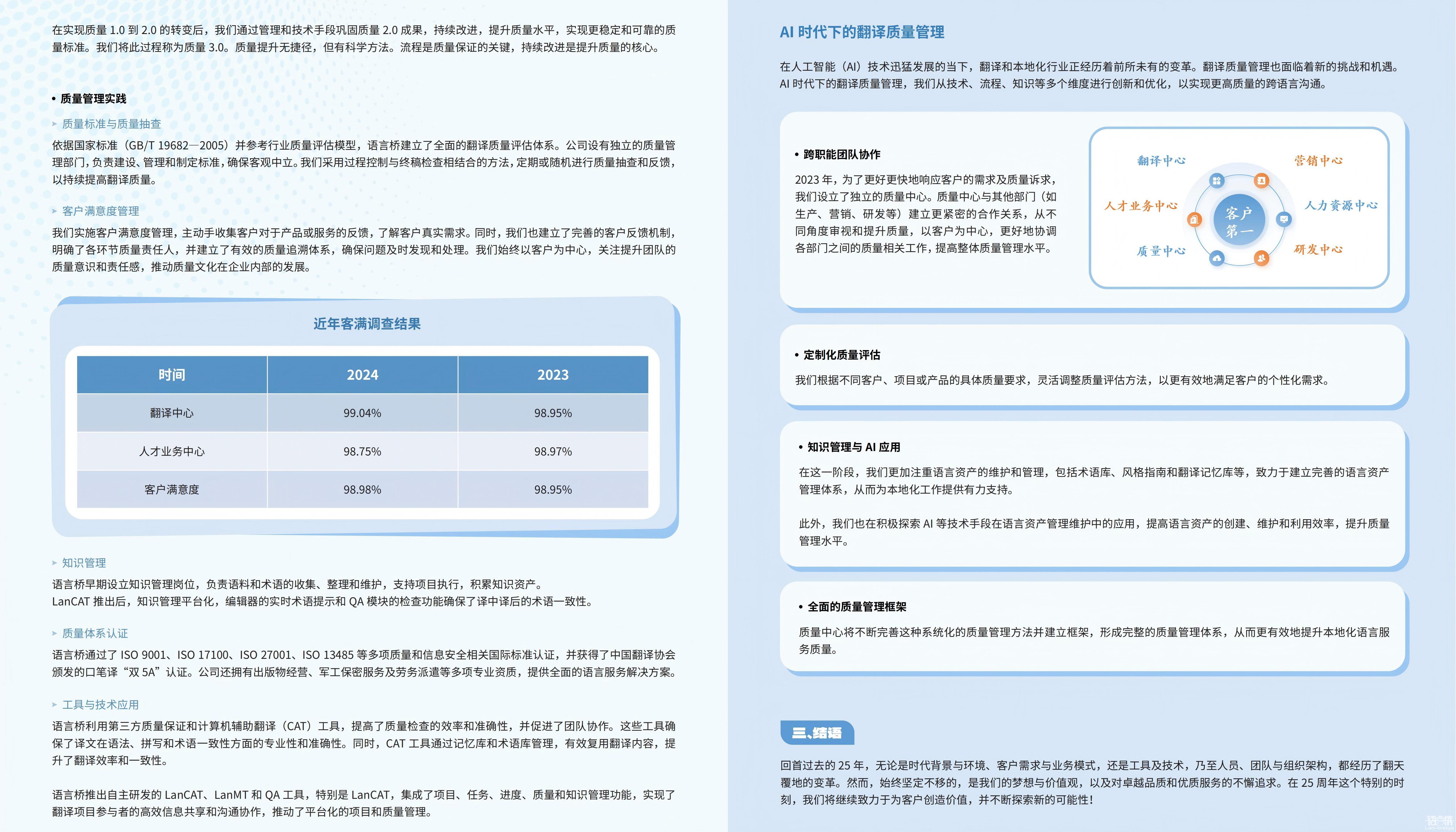 自創(chuàng)立以來,歷經二十五載,語言橋始終秉持“更準、更快、更周到”的服務理念,以“參與、透明、可控”的質量方針為行動指南,不忘品質初心,持續(xù)改進流程和提升質量。我們堅信:人人都是質量第一責任人,每個環(huán)節(jié)都應追求質量零缺陷。